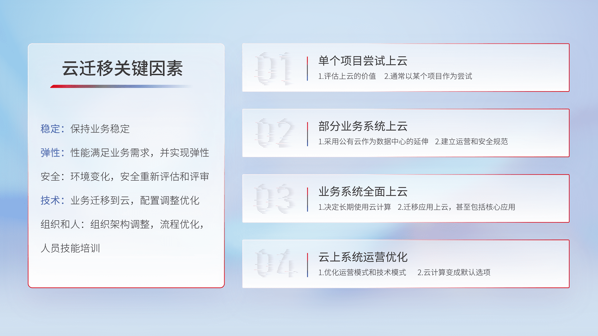 结合实际业务,,从规划设计、、、、云平台选型、、、、云原生改造、、、数据迁移、、、、集成交付,,迁移全过程为客户识别最佳上云路径,,,,做好风险识别管理,,,设计网络架构、、、身份权限、、安全审计合规、、、操作审计、、、日志审计、、、监控告警策略、、多站点容灾设计等,,,对云上基础设施进行整体规划,,提升IT治理水平,,,,以满足弹性、、、、高可用、、、、高性能的需求。。。